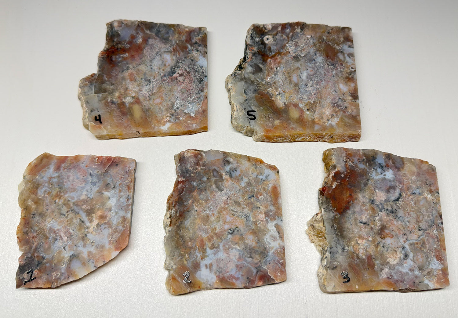 These slabs feature remains of an ancient ecology and are a true piece of the Early Cretaceous period. Highly sought after in this Gem Grade state, this specimen was highly agatized making it perfect for making into cabochons, or polished specimens. We only have these 5 slabs available and after it's gone we may never receive any more of this grade material.