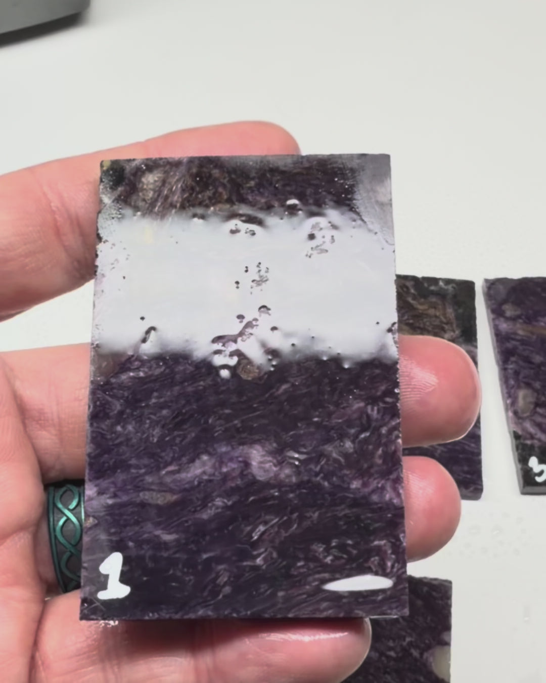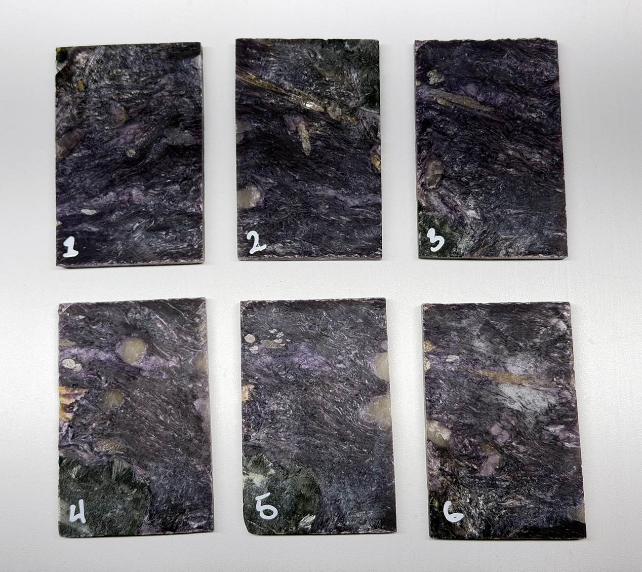 AA Grade Russian Charoite Slabs. Cut in various thicknesses for a wide range of lapidary projects. We graded these slabs based on the dark purple color and relatively minor inclusions. All slabs are shown dry (main image) and shown wet (individually and grouped)