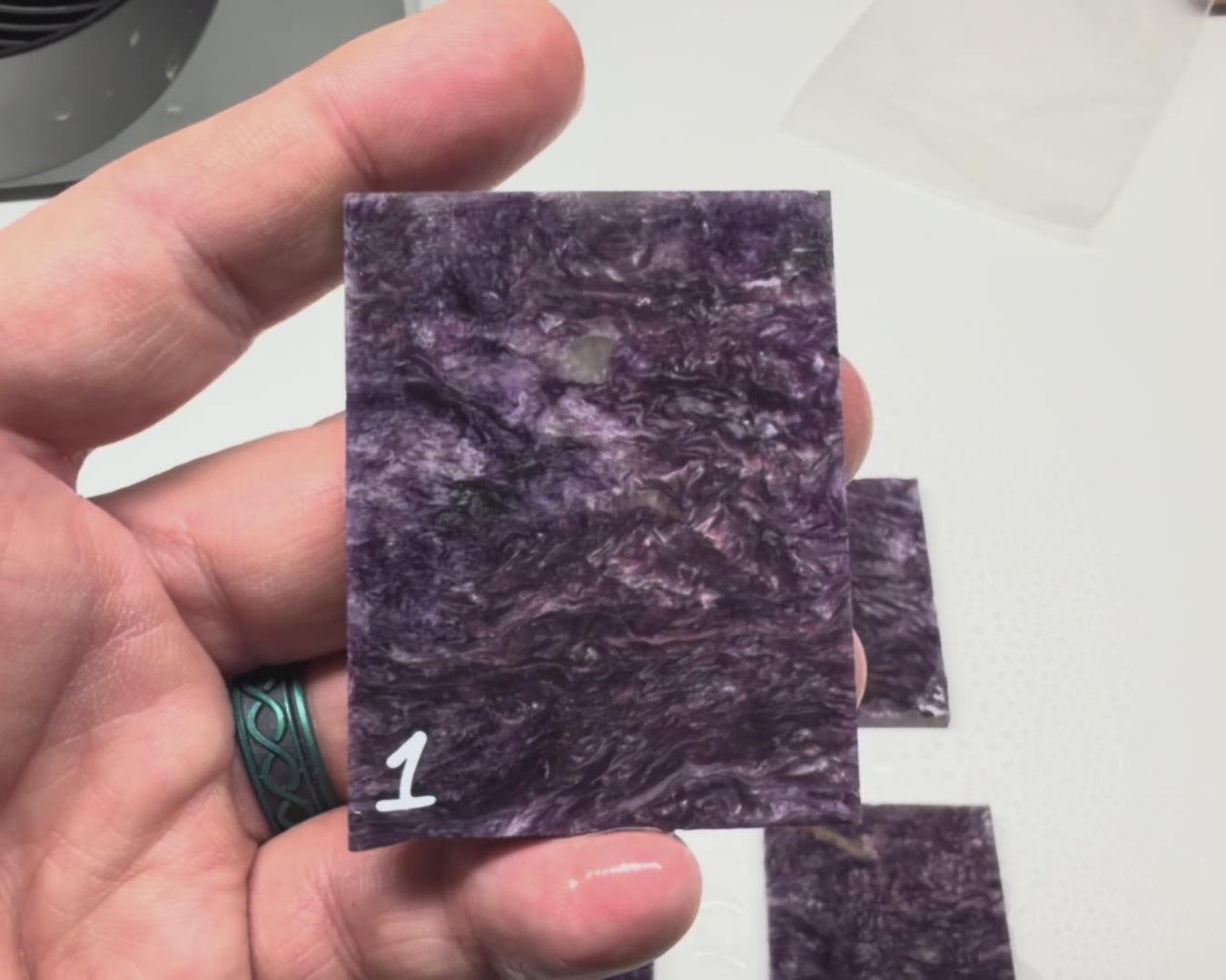 AAA Grade Russian Charoite Slabs. We graded these slabs based on the dark purple color and very minor to zero inclusions. Only about 10% of all Charoite slabs can be graded AAA and when you get slabs with a tiny almost 0% Aegririne or Tinaksite they are truly special. All slabs are shown dry (main image) and shown wet (individually and grouped)